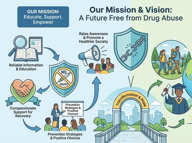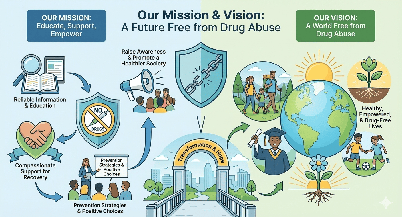 To educate, support, and empower individuals and communities in the fight against drug abuse by providing reliable information, effective prevention strategies, and compassionate support for recovery. We aim to raise awareness, inspire positive choices, and promote a healthier, safer society.